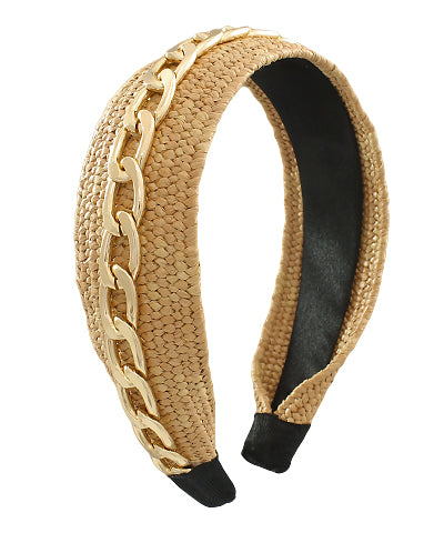 For everyday wear or special occasions, this chic headband features a rattan band with a gold chain embellishment woven to the top. This unique headband is sure to elevate any outfit it's paired with.