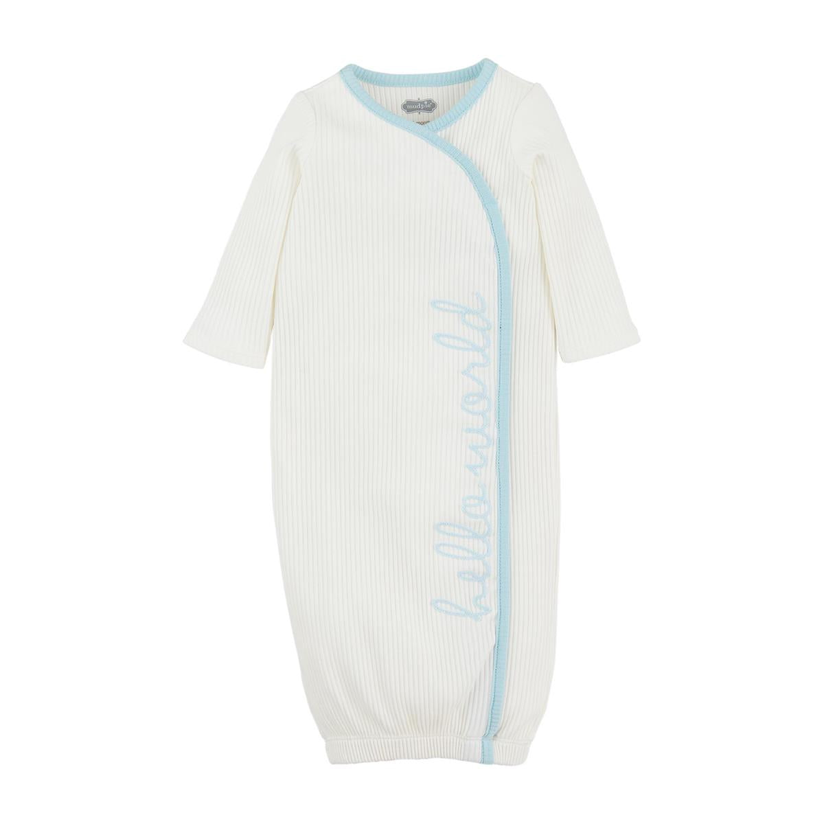 Blue cotton rib long sleeve gown with chain stitched embroidery.