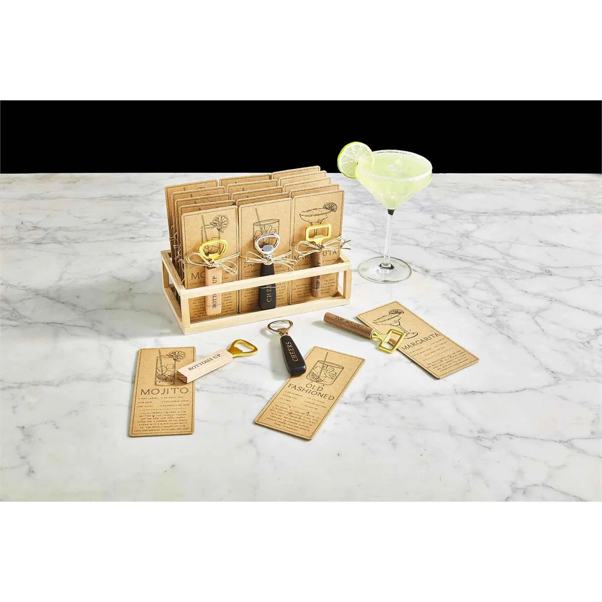 Wood and metal bottle opener comes on drink recipe card. Pair with a bottle of spirits and you have the perfect gift!