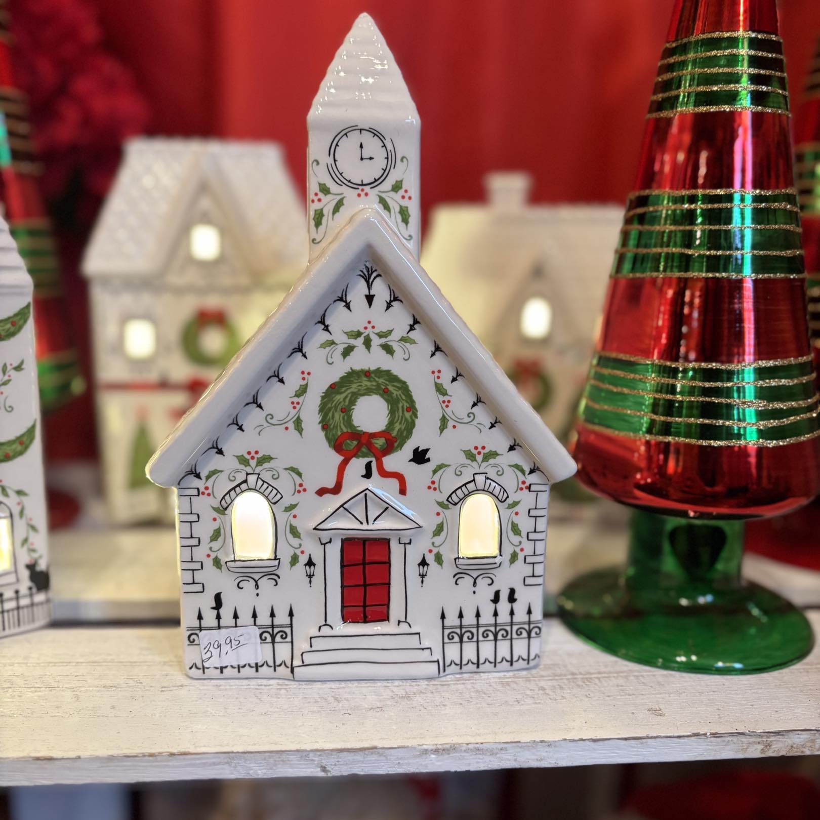 Charming white ceramic steepled church illuminated from within, bringing the whimsical style of 1930s Staffordshire cottageware into a modern festive setting. This white ceramic house glows warmly from within, resting on a base with a convenient on/off switch. It requires 2 × AA batteries (not included) and is not a toy. Perfect for adding a warm, twinkling glow to a mantelpiece, windowsill, or tabletop, it evokes the charm of traditional British festive decorations while fitting seamlessly into modern interiors.