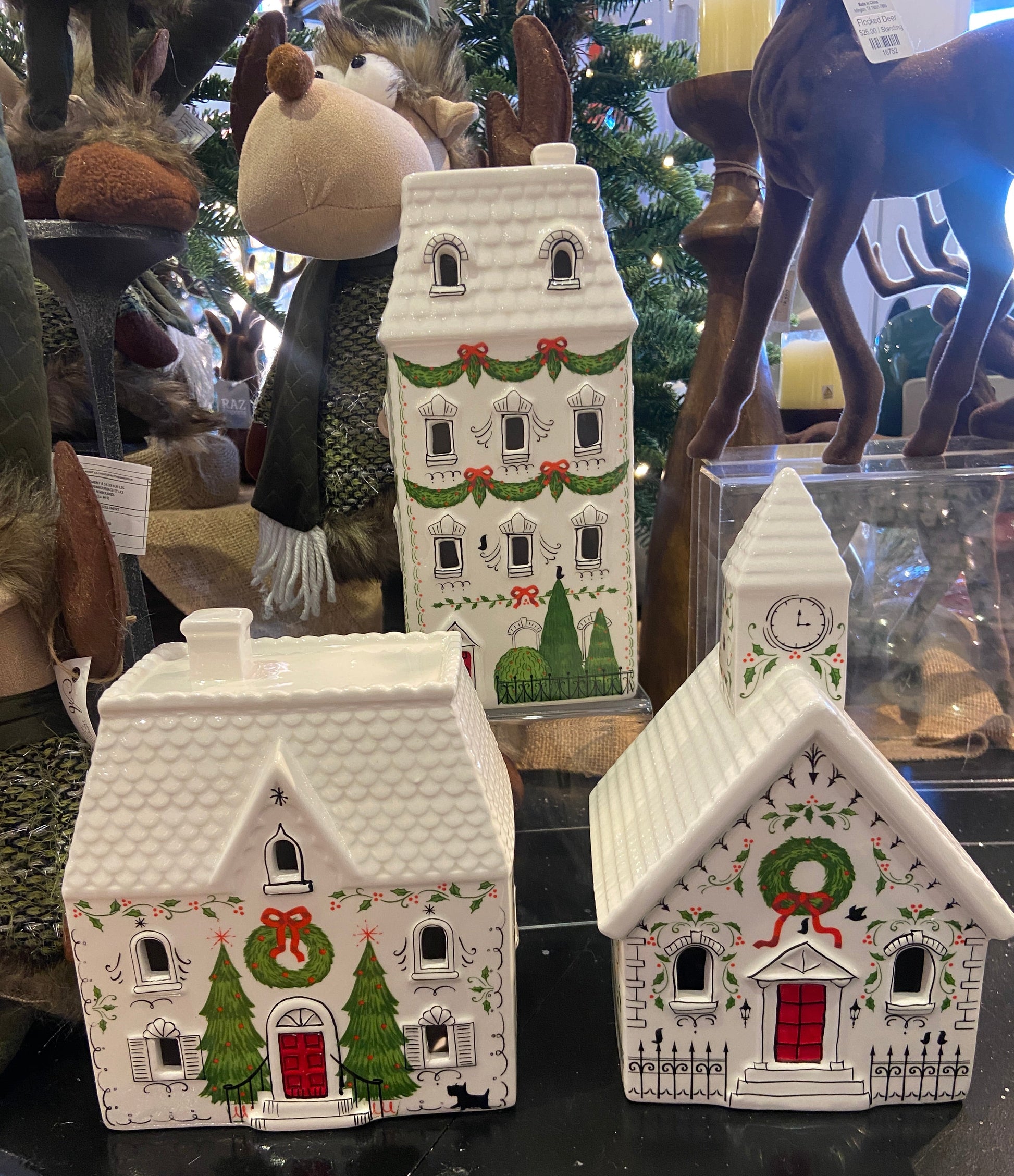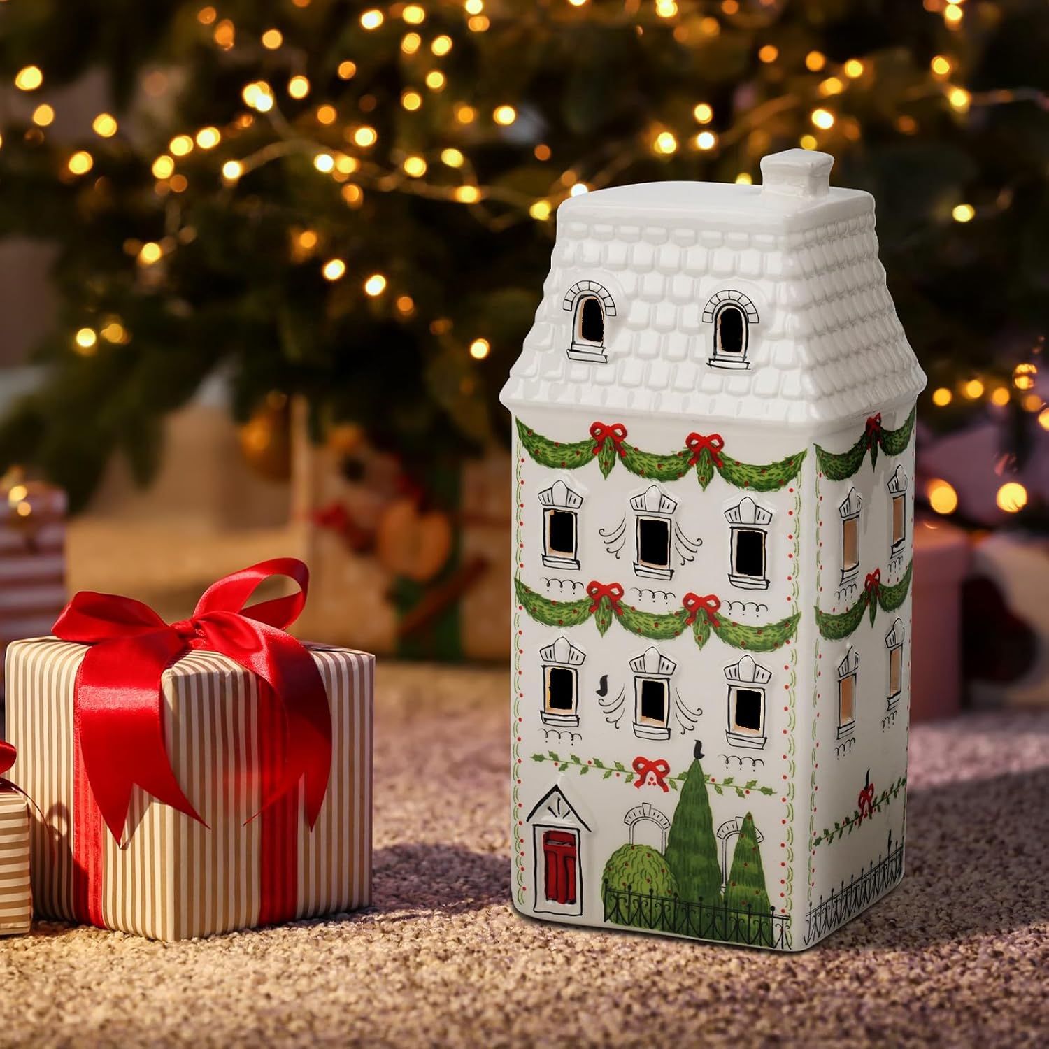 Charming 3-story white ceramic house illuminated from within, bringing the whimsical style of 1930s Staffordshire cottageware into a modern festive setting. This white ceramic house glows warmly from within, resting on a base with a convenient on/off switch. It requires 2 × AA batteries (not included) and is not a toy. Perfect for adding a warm, twinkling glow to a mantelpiece, windowsill, or tabletop, it evokes the charm of traditional British festive decorations while fitting seamlessly into modern interiors.
