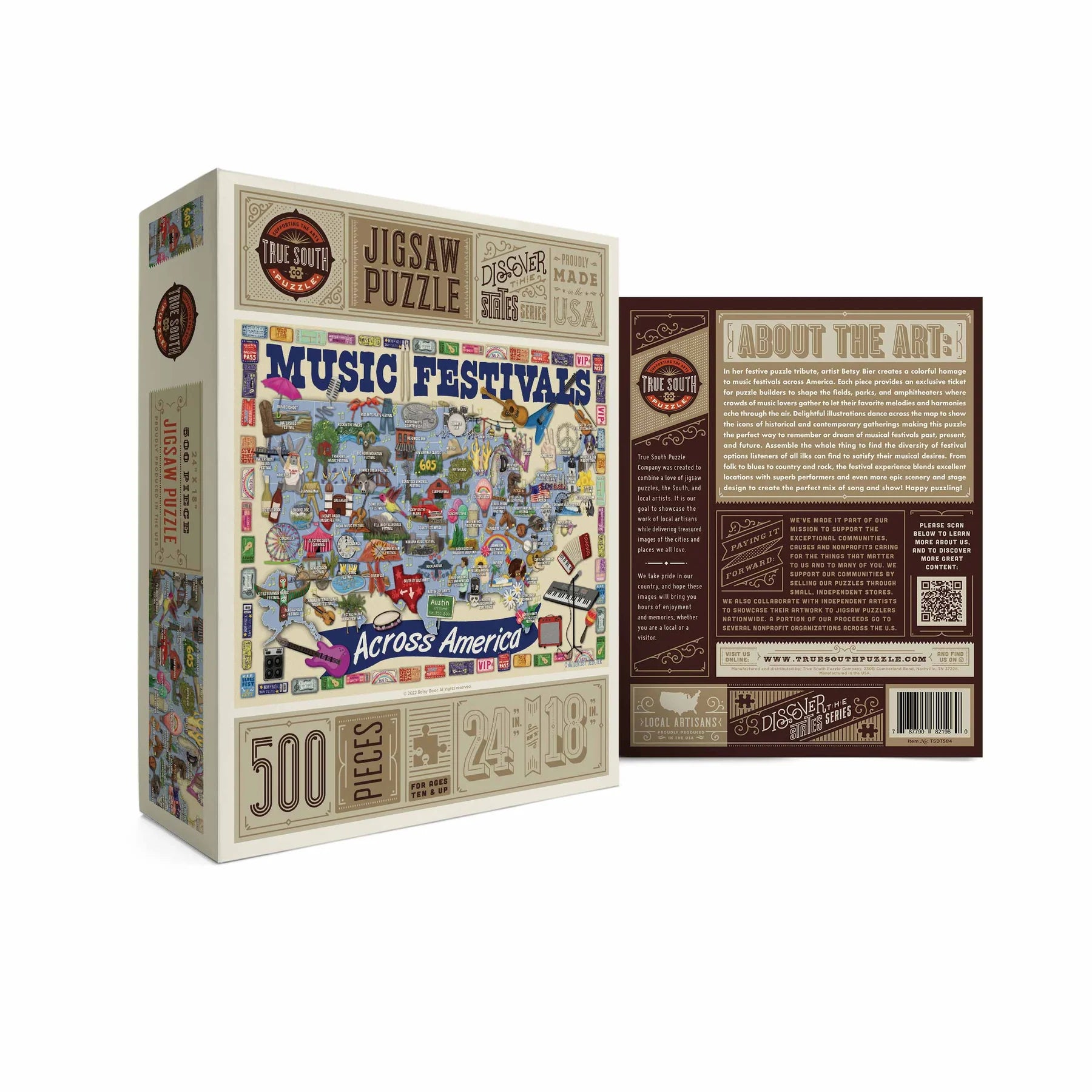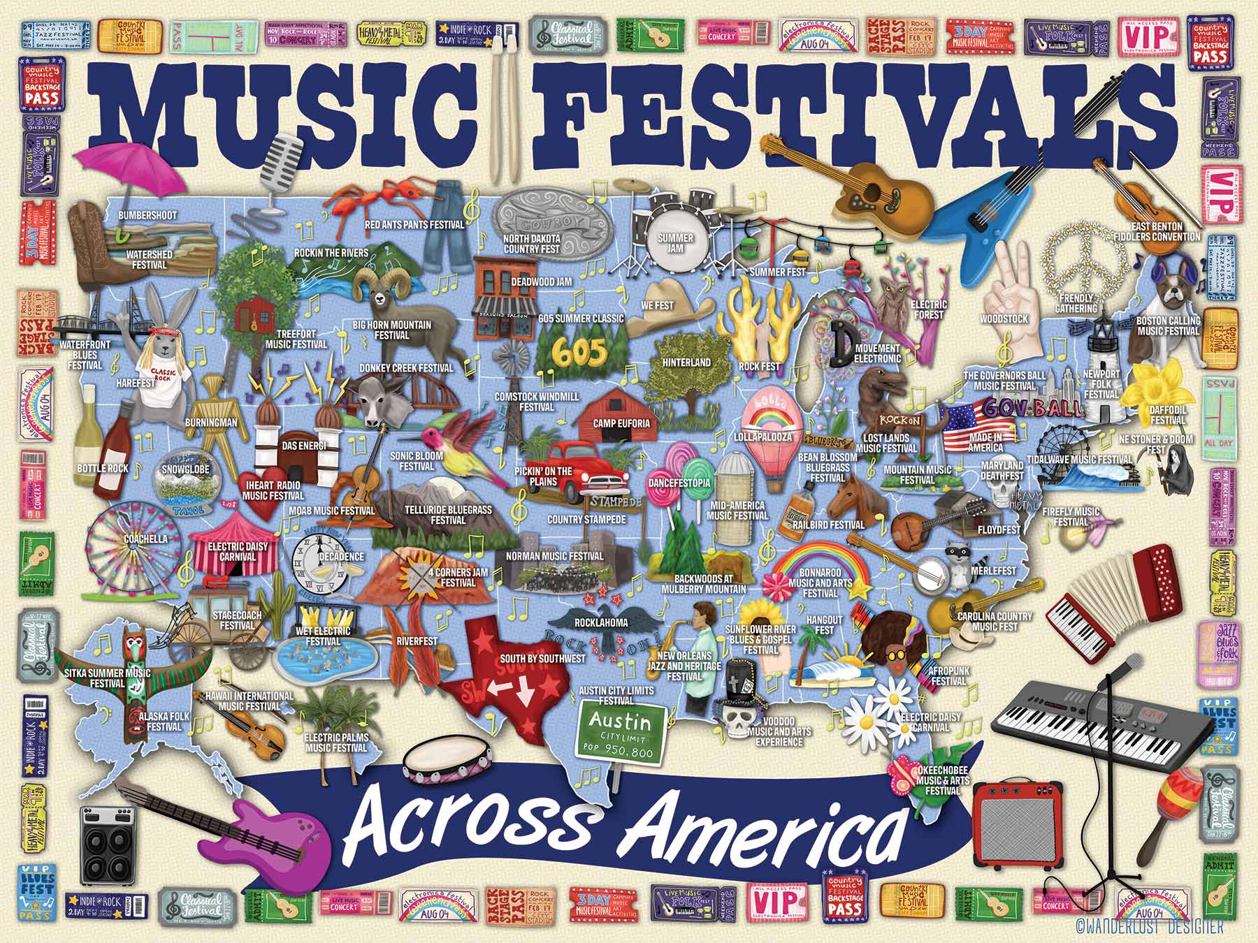 A colorful homage to music festivals - the fields parks and amphitheaters where music lovers gather framed by a ticket stub border in this puzzle by Betsy Beier.