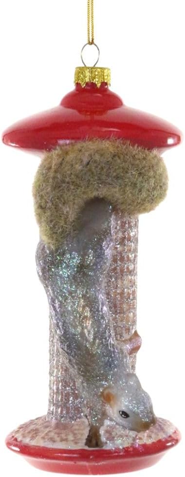 This delightful ornament captures a cheeky squirrel sneaking around a traditional red bird feeder, boasting a fluffy tail and sparkling glitter details. Its playful design celebrates the charm of backyard critters, making it an ideal pick for bird enthusiasts and animal fans wanting to bring some fun flair to their holiday tree. Crafted from premium glass with intricate hand-painted accents, this ornament shines brilliantly on every branch.