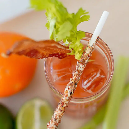 Smoke 'em if you got 'em. Turn up the heat in your beer or Bloody Mary with our Smoke straw. Made with kosher salt, garlic, sesame seeds, onion, Worcestershire sauce, sugar, and natural hickory smoke flavor.