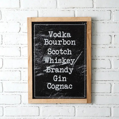 A perfect wall accent for your bar area or man cave. This wall art lists spirits on a chalkboard-like background and is framed in wood. This item hangs using two sawtooth hangers on the back.