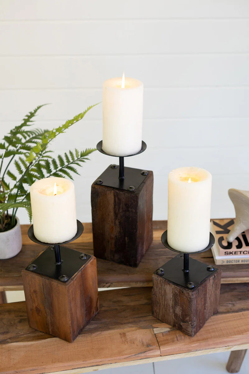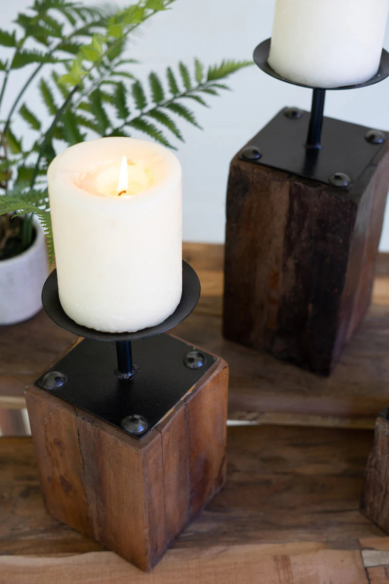 Rustic charm is beaming from our reclaimed wood candle holders. Each holder is created from a recycled furniture legs.